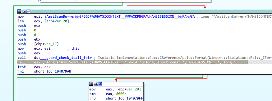 As long as the first DWORD is not equal to “AMSI”, the execution will jump to the following code block:
